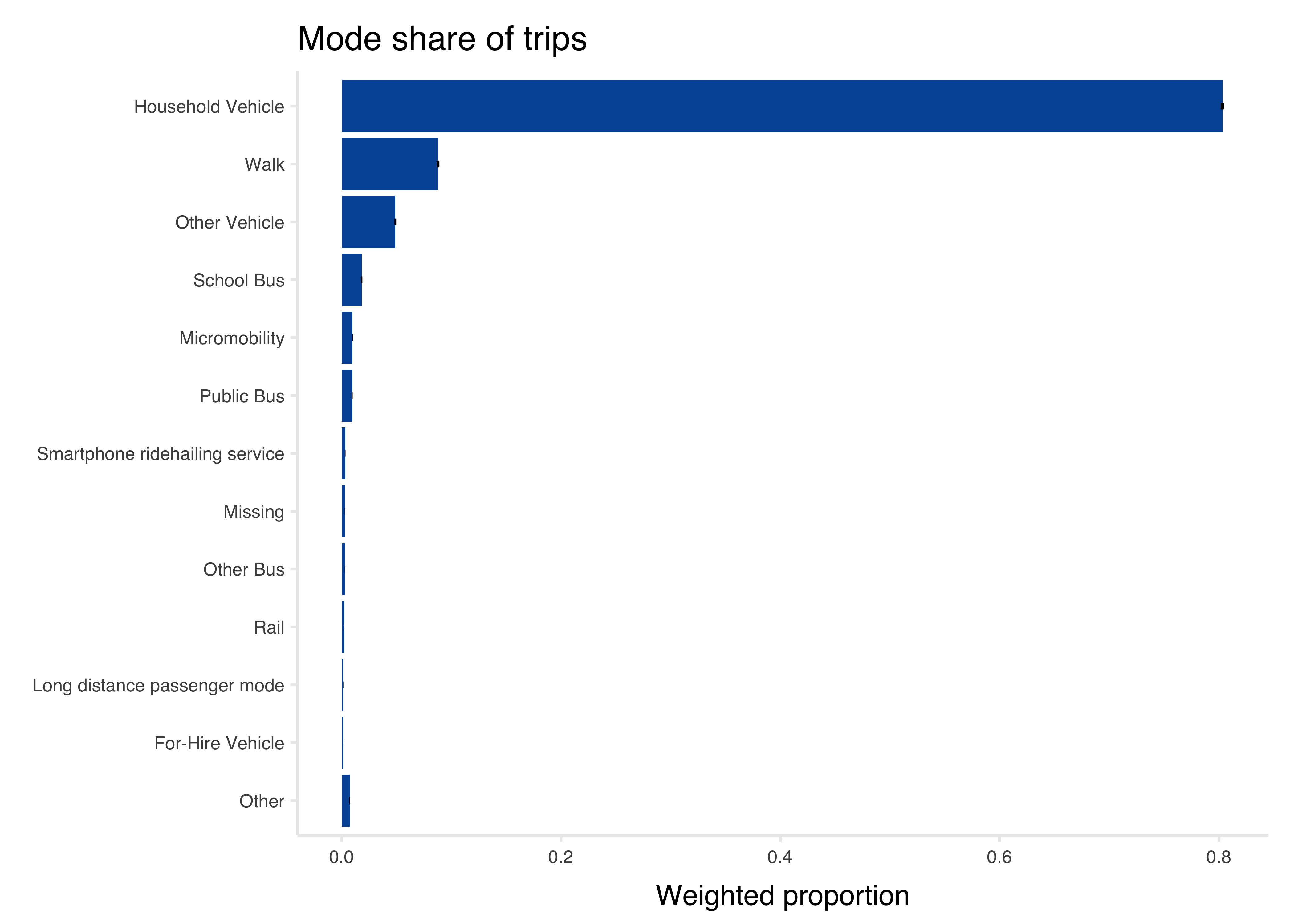 This data user’s guide relies on the combined, upcoded 2019-2023 dataset. In the code chunk below, the raw data are labeled using a convenience function, factorize_df, from the open-source R package travelSurveyTools (link here). The function takes as input the value labels from the combined 2019-2023 codebook. See section Dataset Preparation, Quality Assurance, and Quality Control for more information.